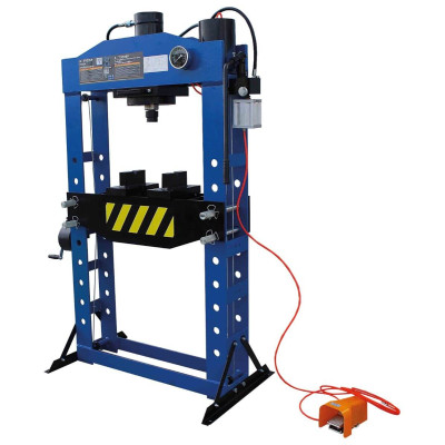 Dílenský lis s hydraulicko-pneumatickým pohonem, maximální tlak 30 000 kg, nastavitelná výška pracovního stolu v 7 úrovních, dálkové ovládání – ASTA A-30021....