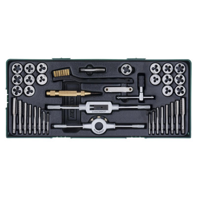 Plastový modul, vel. „C“(425x180x50 mm): Souprava závitníků a závitových oček, sada 40 ks nářadí – JONNESWAY AG10001SP Sada obsahuje:34× závitníky a závitová očka:...